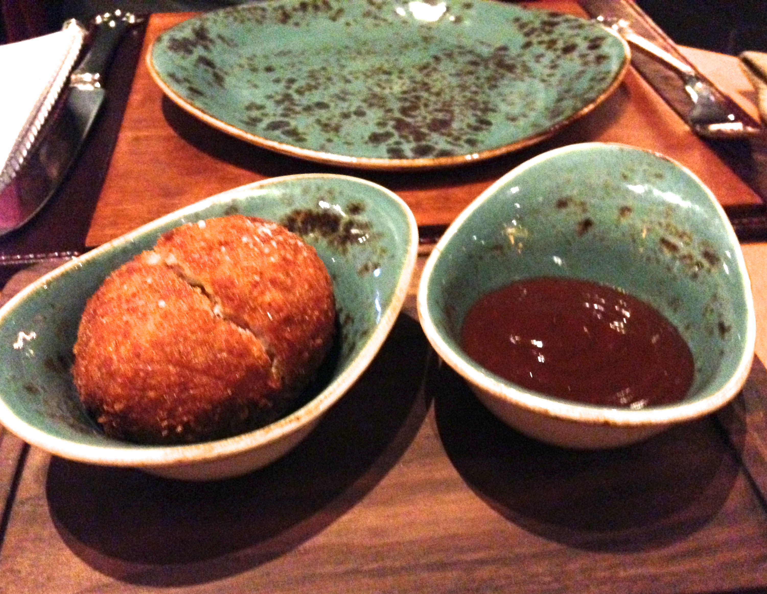 In all fairness, we opted to try it one more time, during their lunch service. We arrived around three o’clock and found ourselves placed in the front section on the far edge of the floor, near the open casino, behind a billboard, and near the server’s station.  Unfortunately, being so near the servers did not help our server redeem the Gordon Ramsay name.  Instead, with only two other tables to attend, he took twenty minutes to greet us with water and menus.  While waiting we noticed the spots on our water glasses and the food particles stuck to my glass.  We also noted that the table behind us received their order, delivered by the runner with a “Here it is, the new and improved version,” and the table to the left of us exclaimed, “Finally!” when the runner brought them theirs; neither table looked pleased and left as soon as their food was consumed.  When our appetizer came, the Scotch Egg, the runner asked if we had ordered it hard boiled, to which replied we did not, but we were going to eat it anyway because we were hungry. (It had been a thirty minute wait for food.)  The egg was cold, the sauce was cold, the plate presented